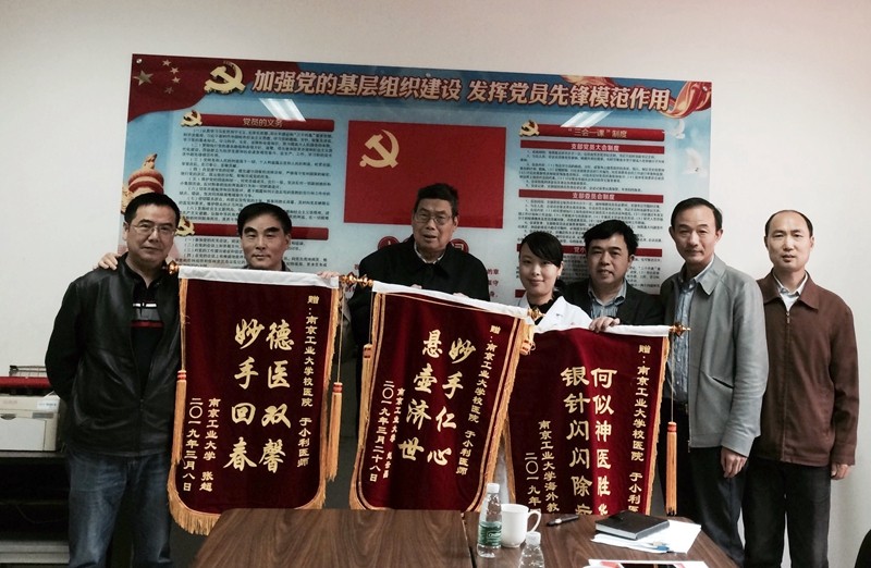 2019年4月26日上午9点,赵云昌、季亚明、张超等三位学校的职工满怀着激动的心情来到江浦校医院,感谢中医针灸科的于小利副主任医师对他们的精心诊治,帮助他们缓解了病痛。并分别向校医院赠送了题为“妙手仁心,悬壶济世”、“医德双馨,妙手回春”、“何似神医胜华佗,银针闪闪除病痛”等三面锦旗,以表达他们的感激之情。
